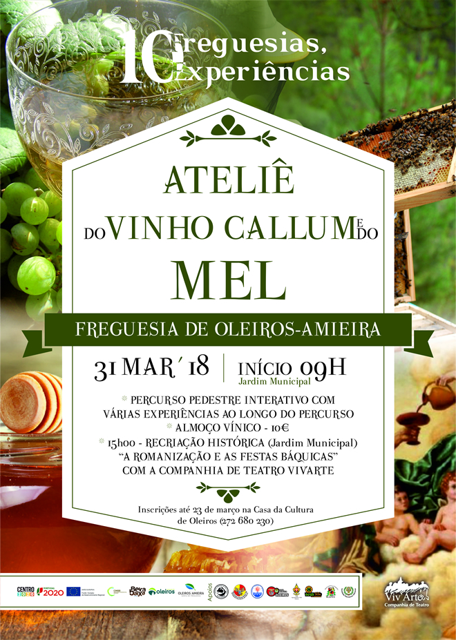 No dia 31 de março de 2018, na Freguesia de Oleiros|Amieira vai realizar-se o Ateliê Temático de Cultura e Gastronomia, dedicado ao Vinho Callum e ao Mel.